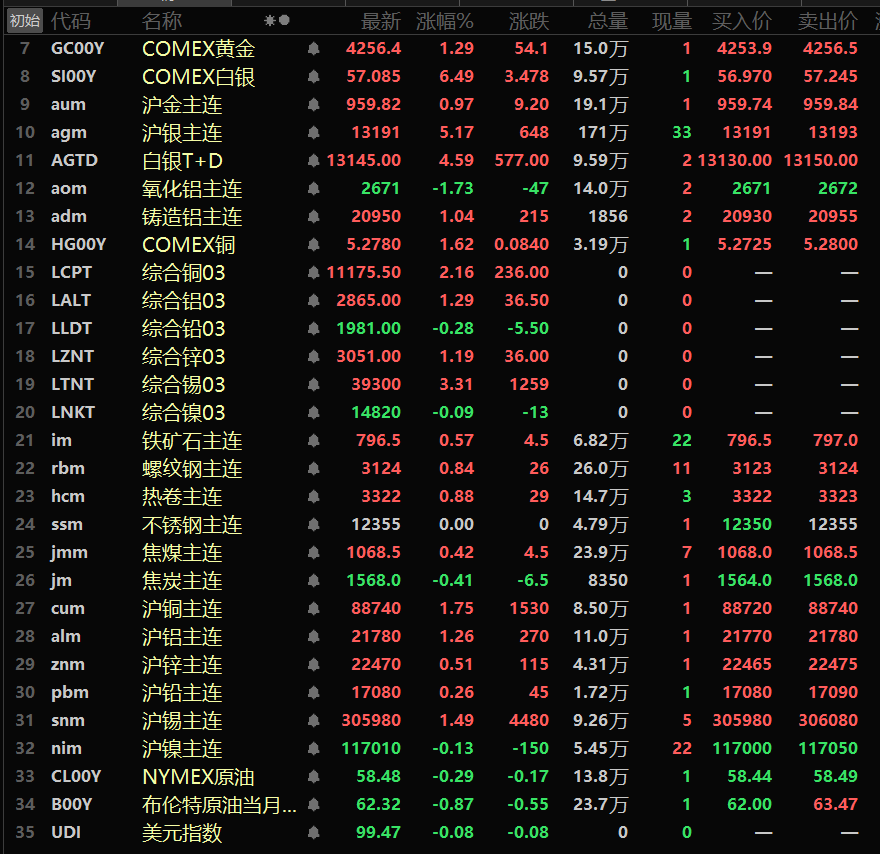 隔夜贵金属方面:COMEX黄金涨1.29%,COMEX黄金周线上涨,当周涨4.34%;COMEX白银涨6.49%,盘中刷新历史新高至57.245美元/盎司,COMEX白银周线大幅收阳,当周涨14.37%。隔夜沪金涨0.97%,其周线上涨,当周涨2%;沪银涨5.17%,盘中刷新历史新高至13239元/千克,沪银周线上涨,当周涨6.56%。