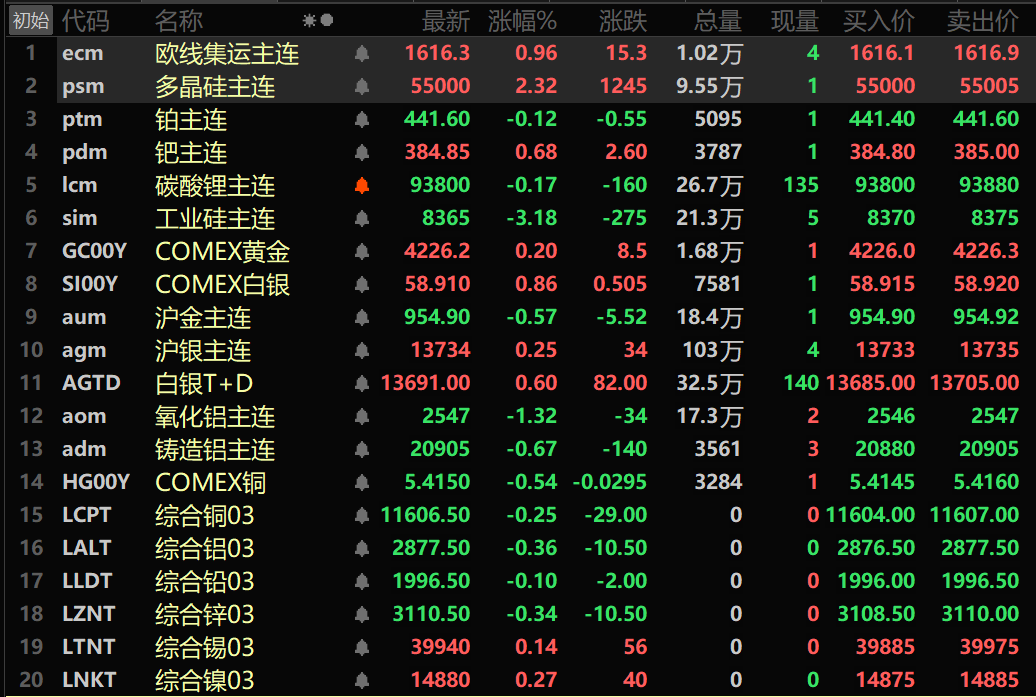 此外,铸造铝主连期货跌0.67%,氧化铝主连跌1.32%。碳酸锂主连涨0.17%。工业硅主连跌3.18%。多晶硅主连涨2.32%。