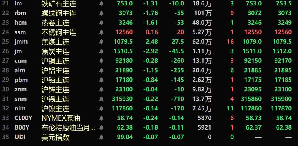 黑色系多飘绿,铁矿跌1.31%,螺纹跌1.76%,热卷跌1.61%,不锈钢涨0.16%。双焦方面:焦煤主力合约跌2.48%,焦炭主力合约跌2.92%。