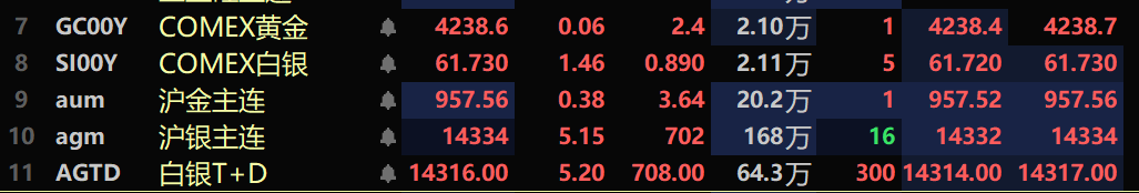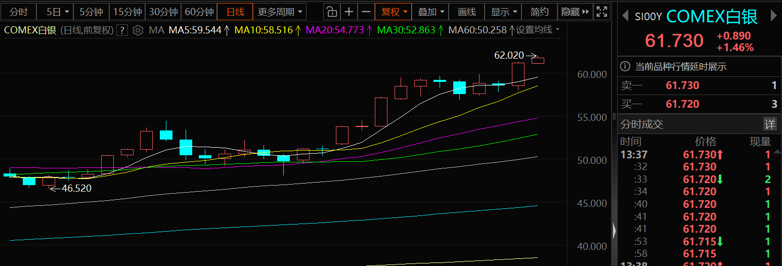 美国就业报告显示劳动力市场表现强于预期,这对金价构成一定压制,限制了其上行空间;但当前市场对美联储12月降息25个基点的概率预期仍高达 87.6%,强劲的降息预期仍为贵金属价格提供核心支撑。供应端上,贵金属尤其是白银的供应持续偏紧,白银多为伴生于铜、铅、锌等主矿的副产品,受铜矿供应偏紧以及铅锌主矿矿山生产动力不足的影响,白银供给增量进一步受限,为银价带来坚实的供应端支撑。与此同时,地缘政治冲突的持续发酵与全球经济增长放缓的压力并存,进一步强化了市场对贵金属这类避险资产的配置需求。尽管国内白银升水回落且库存小幅累积,但市场做多热情不减,部分投机资金的积极布局,为贵金属期股联袂走强注入动力。全球最大白银 ETF——iShares Silver Trust 持仓量持续攀升,接近年内新高,凸显市场对白银的配置需求不断升温。此外,铜价迭创历史新高的强势表现,也带动金银等贵金属及相关工业金属板块整体回暖。截至12月10日13:48分左右,COMEX黄金涨0.06%,报4238.6美元/盎司;沪金主连涨0.38%,报957.56元/克;COMEX白银涨1.46%,盘中刷新历史新高至62.02美元/盎司;沪银主连涨5.15%,盘中刷新历史新高至14388元/千克;白银T+D涨5.2%,盘中刷新历史新高至14398元/千克。