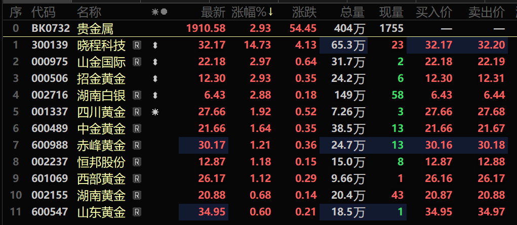 股市方面,截至12月10日13:54分,贵金属板块涨2.93%,个股方面:晓程科技涨14.73%,山金国际、招金黄金以及湖南白银等涨幅居前。