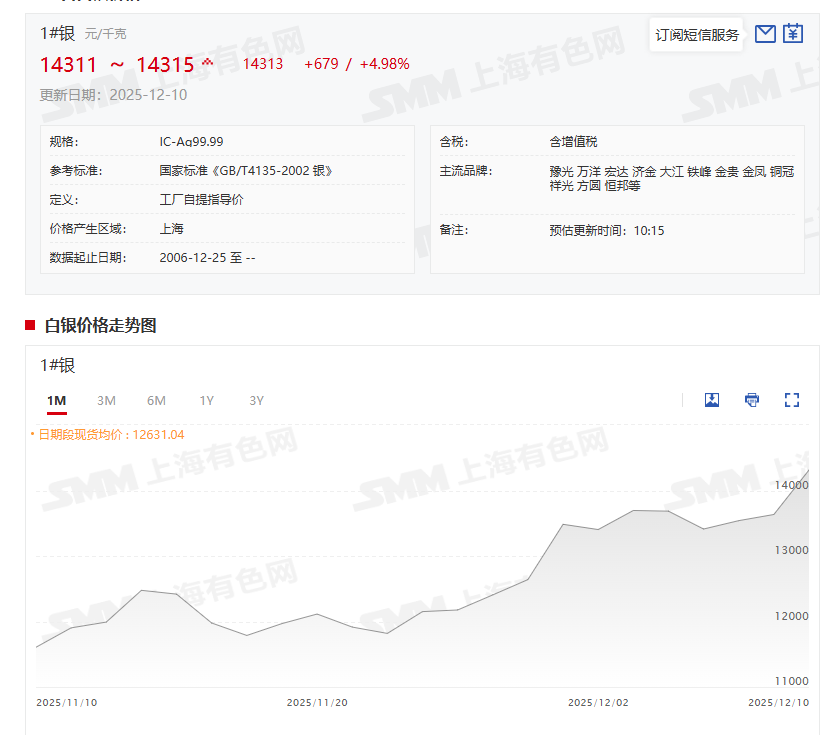 随着银价再创新高,市场成交十分冷清。12月10日,SMM1#白银上午出厂参考均价为14313元/千克,均价较前一交易日涨679元/千克,涨幅为4.98%。据了解,TD-沪银主力2602合约基差收窄,现货市场观望情绪浓厚。上海地区国标银锭持货商主流报价对TD平水报价或沪期银2602合约贴水维持15-20元/千克少量成交。深圳地区银锭持货商对沪期银2602合约贴水20-25元/千克惜售观望,但实际成交贴水或被溢价至25-30元/千克价。日内消费表现较昨日明显转淡,部分终端采购提前关账,银价大幅上涨行情下冶炼厂出货积极性较高但实际成交并不理想,现货市场转为小幅贴水成交。