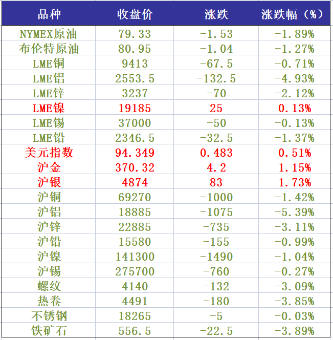 外盘伦镍唯一飘红,小幅收涨0.13%。此前盘中伦镍也跟随其他金属一同下跌,在临近收盘时回温,最终收涨0.13%。据11月4日LME镍库存数据显示,伦镍库存继续下滑,最新数据下跌1782吨,达138096吨。