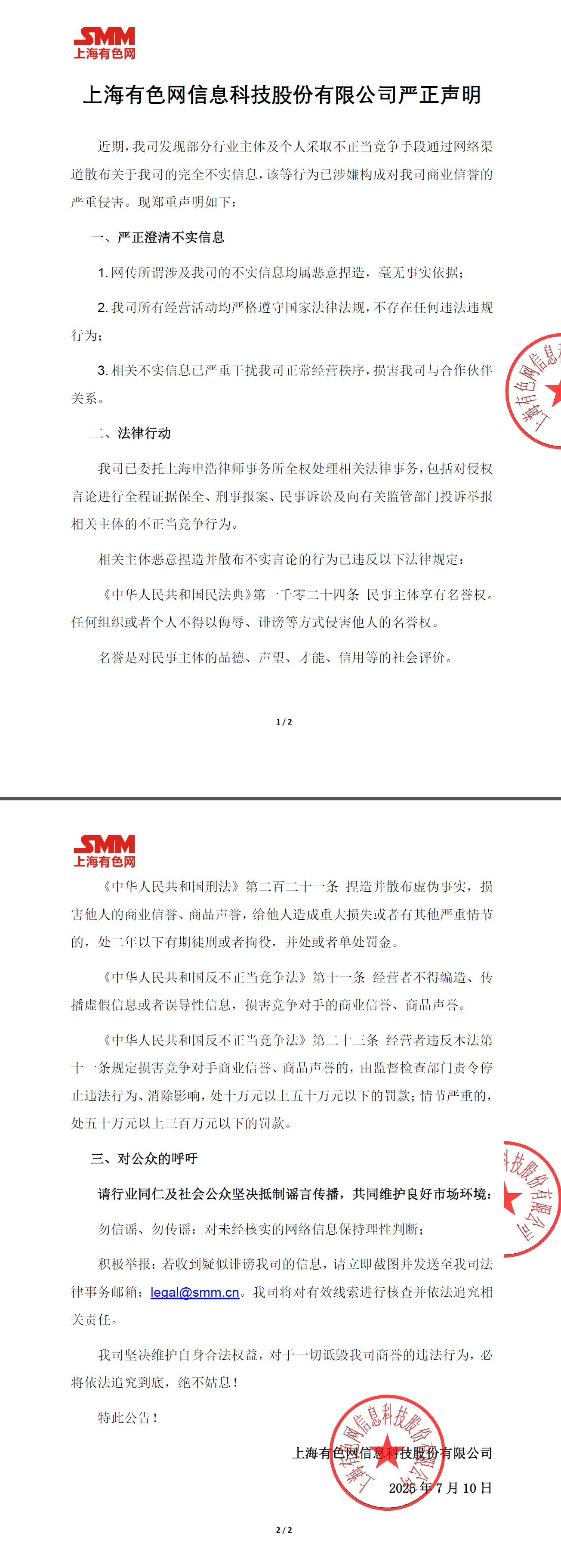 勿信谣、勿传谣:对未经核实的网络信息保持理性判断;积极举报:若收到疑似诽谤我司的信息,请立即截图并发送至我司法律事务邮箱:legal@smm.cn。我司将对有效线索进行核查并依法追究相关责任。