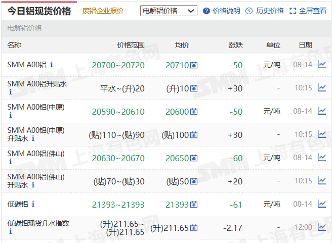 尊敬的用户: 您好! 2025年8月14日SMM A00铝中原报价为20590-20610元/吨,网站前台显示已做更正,对您造成的不便深感抱歉。