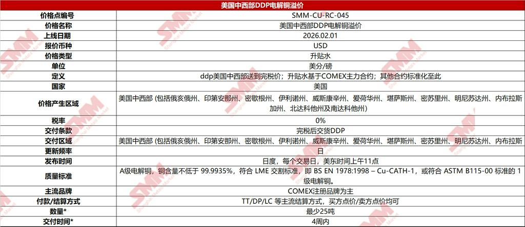 在此背景下,上海有色网(SMM)于2026年2月1日正式推出美国中西部DDP电解铜溢价(单位:美分/磅),该价格将以代表性中西部地区完税交割现货交易为基础,综合参考仓单流转成本、区域物流运费、交易活跃度及品牌偏好等因素,形成具有代表性的市场结算参考价。价格每日更新,并同步在SMM官网页面展示,用户可查阅历史曲线与分析数据。