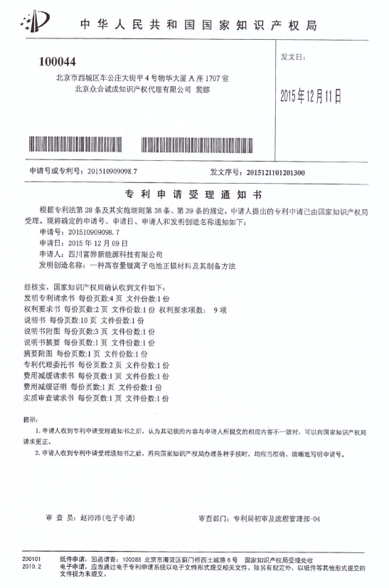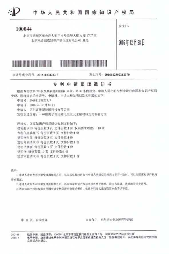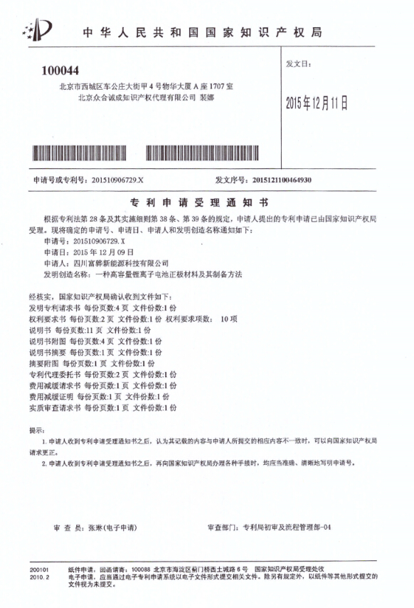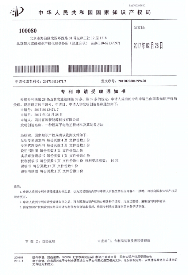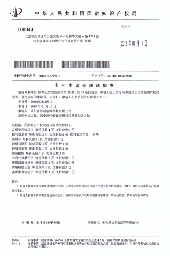 四川富骅新能源科技有限公司以生产高端锂离子电池正极材料为主。主要包括:高电压钴酸锂正极材料(HVLCO)、高镍镍钴锰三元正极材料(NCM)、镍钴铝三元正极材料(NCA),同时还生产新型高容量高性能锰酸锂及高温长寿命尖晶石锰酸锂正极材料(LMO)和磷酸亚铁锂正极材料(LFP)。公司拥有上述正极材料的核心专利技术和知识产权。