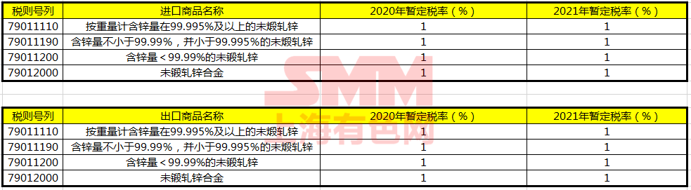 据SMM了解,2020年和2021年的锌相关产品的进出口关税维持原状。具体涉及锌相关产品进出口关税情况分别如下: