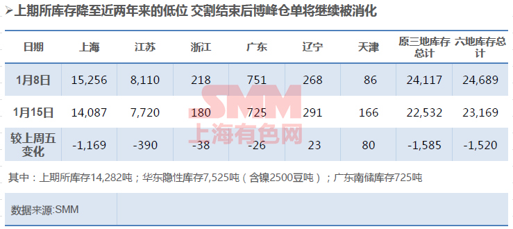 据SMM调研了解,本周五(1月15日)上海保税区铜库存环比上周五(1月8日)增加0.02万吨至35.35万吨。周内进口窗口仍处于关闭状态,亏损幅度在300元/吨以上,报关需求较低,但同时入库量也有限,船期延误导致境外到港货源整体偏少。综合作用下,本周保税区铜库存基本持平。
