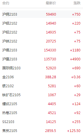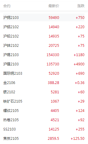 SMM1月15日讯:早间当选总统拜登宣布1.9万亿美元的疫情纾困方案,宏观氛围整体偏暖,提振金属走势,上午金属全线飘红,沪镍保持领涨但涨幅有所收缩。截止午间收盘,沪铜涨1.28%,沪铝涨1.49%,沪锌涨0.36%,沪铅涨0.5%,沪镍涨3.75%,沪锡涨0.77%。
