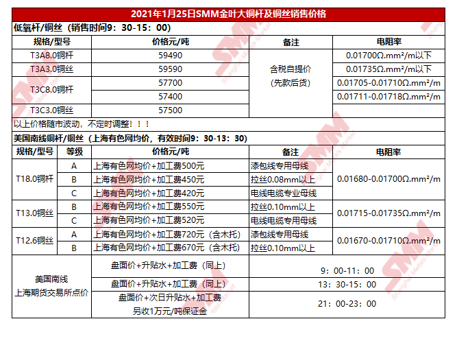 1月25日SMM金叶大铜铜杆及铜丝报价