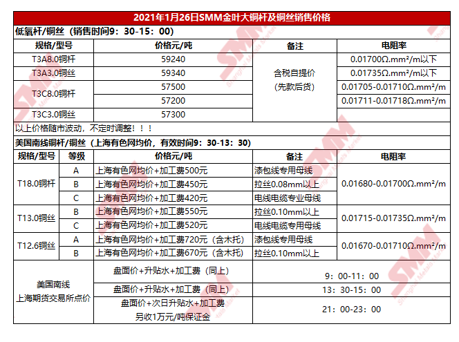 1月26日SMM金叶大铜铜杆及铜丝报价
