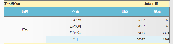 今日,上期所不锈钢注册仓单增加6493吨至66017吨,其中:中储无锡仓库增加55吨至25302吨,五矿无锡仓库增加60吨至34337吨,玖隆物流仓库今日仓单首次增加6378吨。据市场消息,因运输问题,可能会导致交割资源无法及时入库,因此部分资源发往玖隆仓库,今日完成大部分仓单制作。