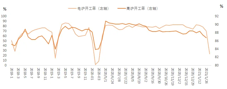 春节的脚步已经渐行渐近,各电炉钢厂已经陆续停产放假,是导致开工率直线下降的主要因素。然而,当前开工率仍略高于往年同期(尤其2020年同期由于疫情,电弧炉钢厂几乎全部处于停工状态)。这与电炉厂盈利状况高于往年同期以及疫情因素有关。