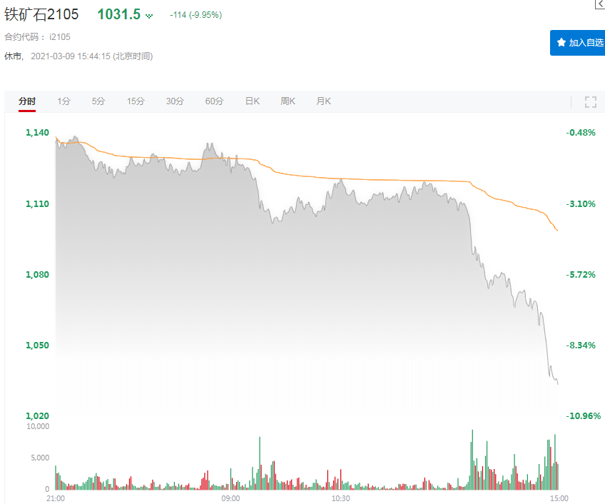 SMM3月9日讯:午后铁矿石期价加速下行,截止日间收盘,铁矿主力下跌9.95%报1031.5元/吨,刷新1个月低位,触及跌停价1031元/吨。