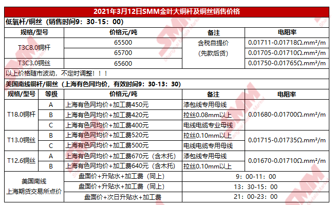 3月12日SMM金叶大铜铜杆及铜丝报价