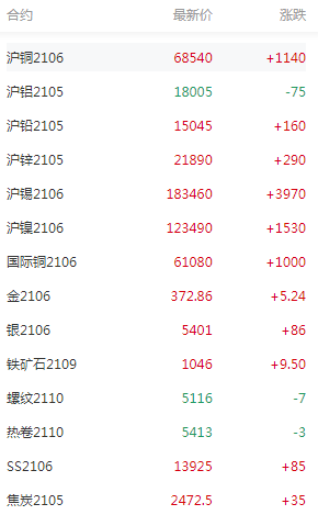 SMM4月16日讯:经济加快复苏,提振市场风险偏好。金融市场美国三大股指全部收涨,10年期美债收益率跌至五周低点,强劲的风险偏好削弱了美元的吸引力,提振金属市场。截止日间收盘,沪铜涨1.69%,沪铝跌0.41%,沪锌涨1.34%,沪铅涨1.07%,沪镍涨1.25%,沪锡涨2.21%,国际铜涨1.66%。