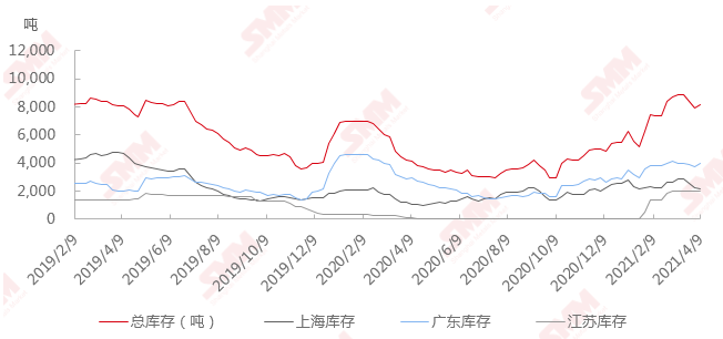 库存方面,LME锡库存持续低迷,截止4月15日数据,LME锡库存达1600吨。海外供应持续短缺,上周三印尼贸易部发布3月印尼精炼锡出口量为6043吨,环比增长40.1%。但是海外市场精炼锡供应紧张未因此得到显著改善,此外,印尼天马相关负责人上周表示天马公司2021年预期产量为34000吨,较2020年下降11700吨;2021年预期销量为31000吨,而2020年精锡销售量为55782吨。这使得市场加剧对印尼锡供应的担忧。