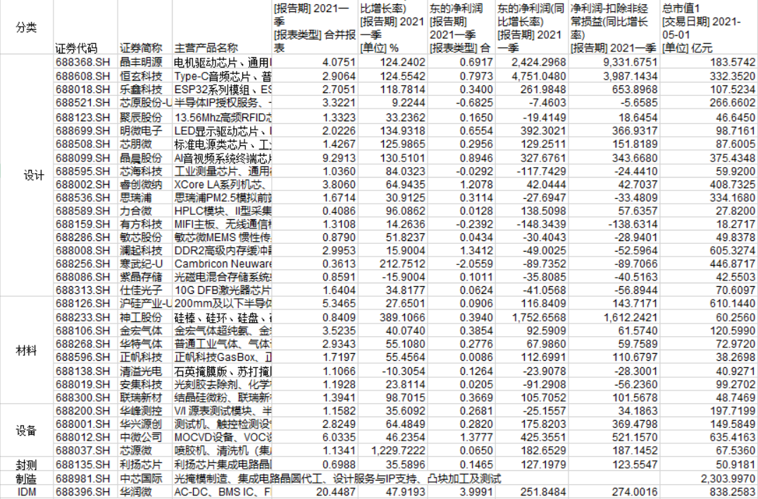 据统计,从2021年一季度的业绩表现看,除中芯国际外(注:一季报尚未披露),28家科创板半导体上市公司归母净利润盈利,其余4家公司中,有2家为股票带“U”的未盈利上市公司。