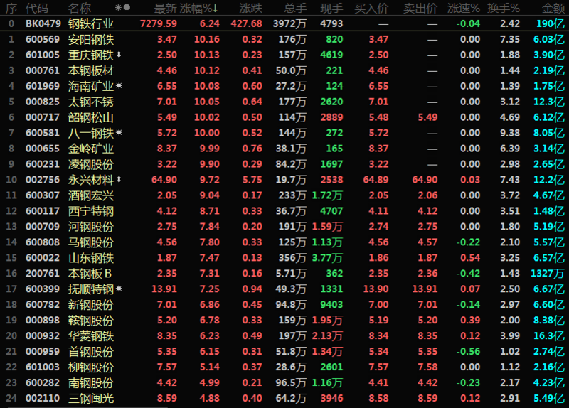 今日钢铁股市板块逆市大涨,煤炭采选、有色金属、船舶制造等板块也涨幅居前,截止日间收盘,钢铁行业板块涨6.24%,个股方面,安阳钢铁、重庆钢铁、海南矿业、本钢板材、太钢不锈、韶钢松山、八一钢铁、金岭矿业涨停,其余个股均大幅上涨,41只钢铁个股中仅一只个股小幅飘绿。