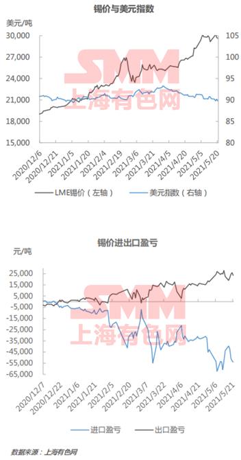 国内:锡矿方面,缅甸锡矿因矿山人手不足导致采选速度放慢,进口受限;锡锭方面,因出口需求大增,社会锡锭库存加速下降:因限电原因,本周五起云南个旧地区除云锡之外的锡厂集体停产,后市需关注此次停产将持续多久,这对国内锡价构成支撑以及提振作用。