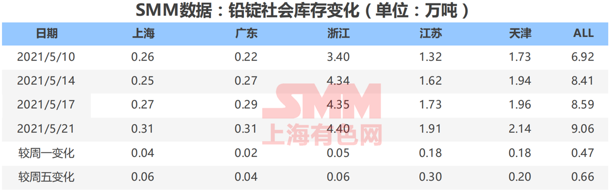 据SMM调研,截至周五(5月21日),SMM五地铅锭库存总量至9.06万吨,较上周五(5月14日)环比上升0.66万吨;较周一(5月17日)上升0.47万吨,并刷新2015年6月以来的高位。