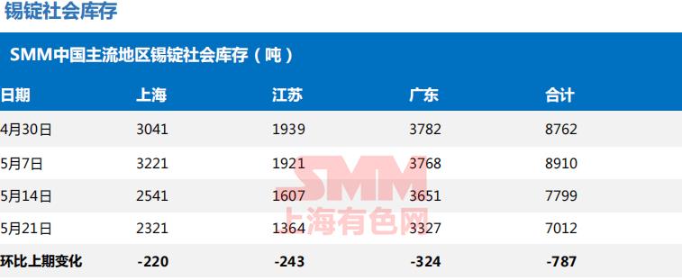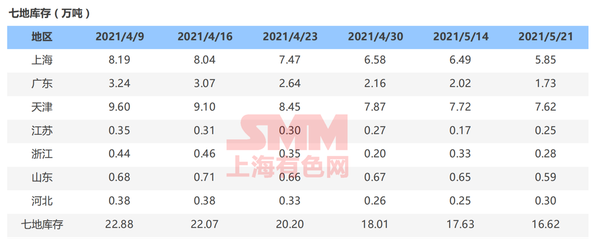 据SMM了解,截至本周五(5月21日),SMM七地锌锭库存总量为16.62万吨,较本周一(5月17日)下降5000吨,较上周五(5月14日)下降10100吨。本周国内库存继续保持去化,上海地区,进口锌流入放缓,市场消化国产锌为主,库存保持下降;广东地区,云南冶炼厂限电限产影响市场到货,仓库库存继续走低;天津地区,下游订单一般,且看跌锌价,整体维持刚需采购,库存略降。总体来看,原沪粤津三地库存下降10300吨,全国七地库存录得下降10100吨。