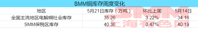 据SMM调研了解,本周五(5月21日)上海保税区铜库存环比上周五(5月14日)增加0.19万吨至40.38万吨,库存连续第五周增长。外贸市场交投氛围疲弱,本周进口亏损幅度在700元/吨左右波动,难以支撑报关进口需求,到港货源陆续流入保税库中,另外国内冶炼厂继续向保税库不断输入电解铜,也带动库存的增长。