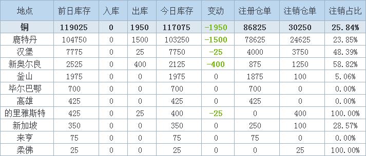 5月19日LME金属库存及注销仓单数据