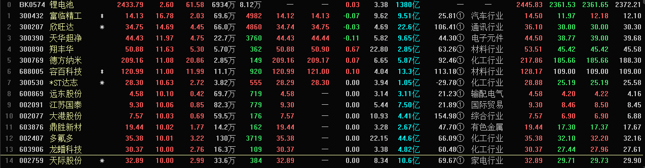 6月4日最新消息:锂电池概念股早间开盘强势拉升,于短时间内迅速走高。与此同时,个股方面表现也十分抢眼,江苏国泰、鼎盛新材、永太科技、藏格控股、安纳达以及科陆电子等6股拉升封板,另包括富临精工、欣旺达以及容百科技等多股在内的个股一度涨超14%。而截止收盘,包括天际股份、多氟多以及盛新锂能等在内的13股封住涨停板,欣旺达、容百科技以及天华超净等多股涨超10%。