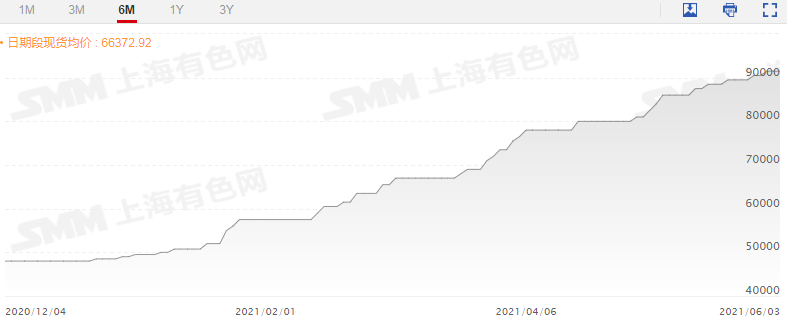 截止6月3日,据SMM现货报价显示,电池级氢氧化锂报价91500元/吨,已较年初暴涨84.8%。