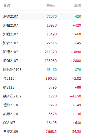 贵金属方面,沪金涨0.73%,沪银涨1.54%,国际金价周五徘徊在每盎司1,900美元的关键水平附近,受到美元走软和美国公债收益率下降扶助,投资者对显示美国通胀率上升的数据泰然处之,并希望美联储不改变其鸽派立场。周四公布的数据显示,美国5月消费者物价指数(CPI)强劲攀升,创下近13年来最大同比升幅,上周美国初请失业金人数降至近15个月来最低。
