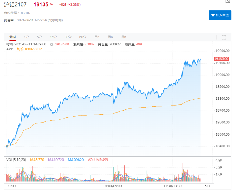SMM6月11日讯:午后有色板块集体上攻,其中期铝主力合约大幅拉升站上19000点,期价触及近3周新高。截止发稿,沪铝期货主力合约上涨3.38%,报19135元/吨,主力合约增仓近1.5万手。目前国家调控政策落地,利空出尽后,多头资金再度进场推动铝价走高。