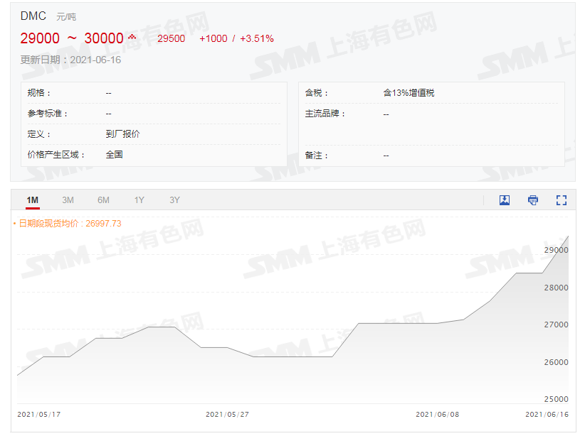据SMM,6月16日有机硅现货均价报29500元/吨。