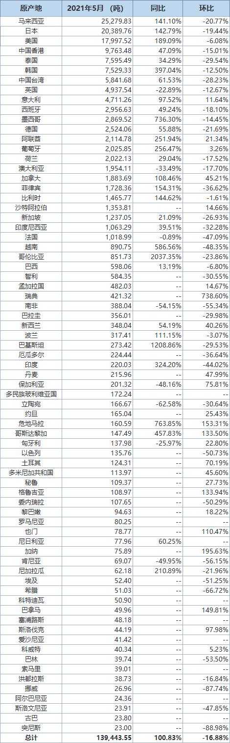 以下为根据中国海关总署官网数据整理的2021年5月废铜进口分项数据一览表:
