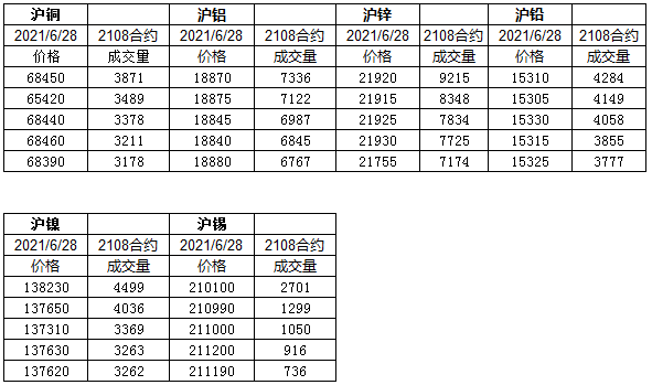2021年6月28日上期所金属主力市况
