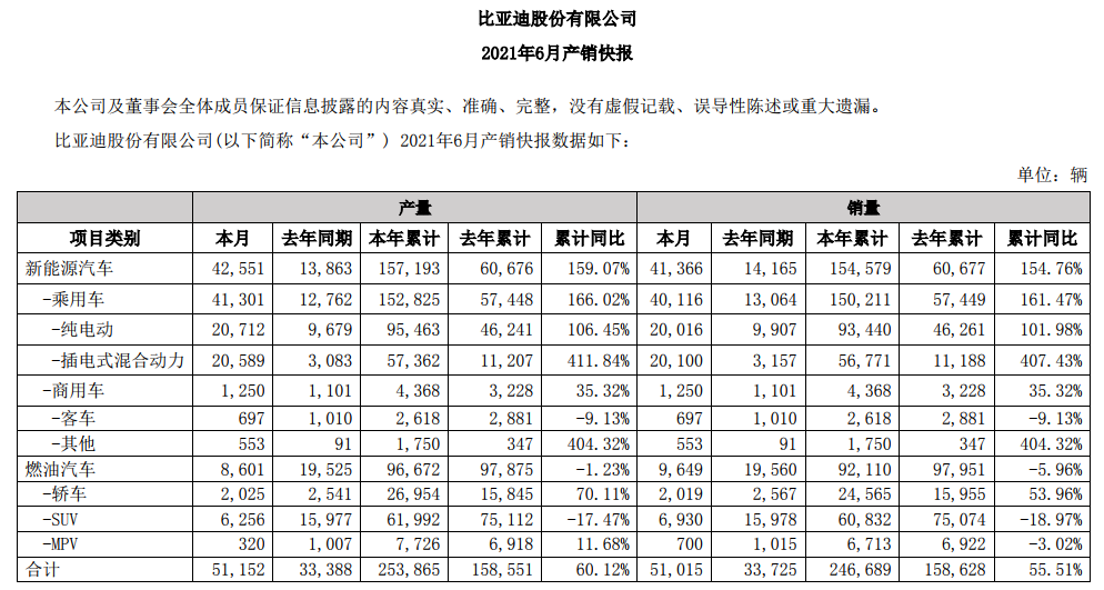 近日,比亚迪发布2021年6月产销快报,公告显示,6月产量合计51152辆,同比增长53.20%;销量合计51015辆,同比增长51.27%。其中,新能源汽车6月产量42551辆,本年累计产量15.72万辆,同比增长159.07%。6月销量41366辆,本年累计销量15.46万辆,同比增长154.76%。