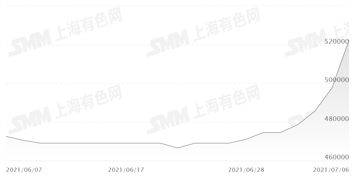 近日轻稀土价格持续走高,7月6日,SMM镨钕氧化物现货均价报522500元/吨,较昨日上涨25000元/吨,SMM镨钕金属现货均价报632500元/吨,较昨日上涨23500元/吨。自六月底以来,轻稀土价格持续上涨,SMM镨钕氧化物现货价格较6月30日均价涨幅超10%,SMM镨钕金属现货价格较6月25日均价涨10%。