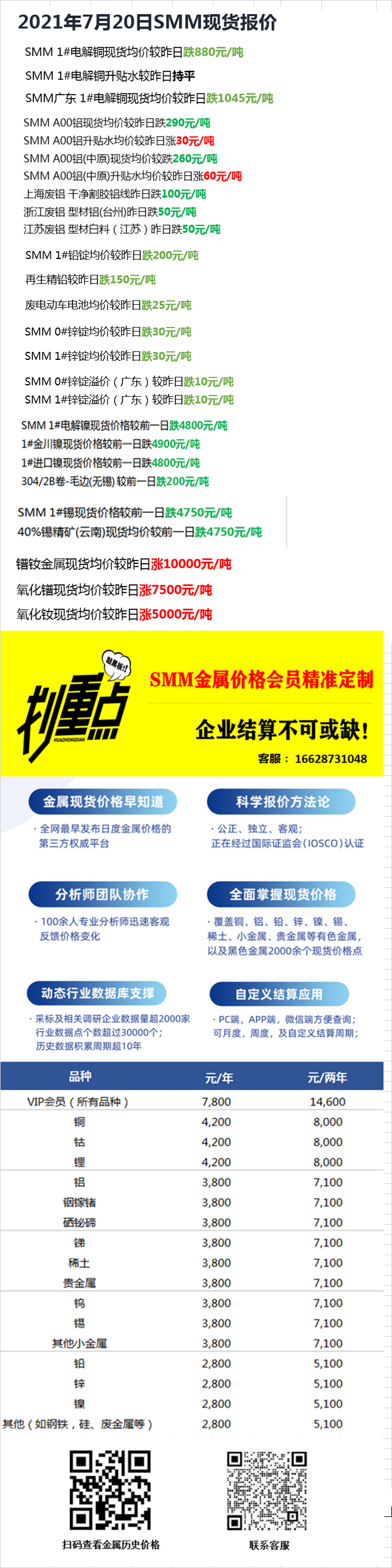7月20日SMM金属现货报价(新增废铝报价) | 金属价格普遍回落、稀土仍涨