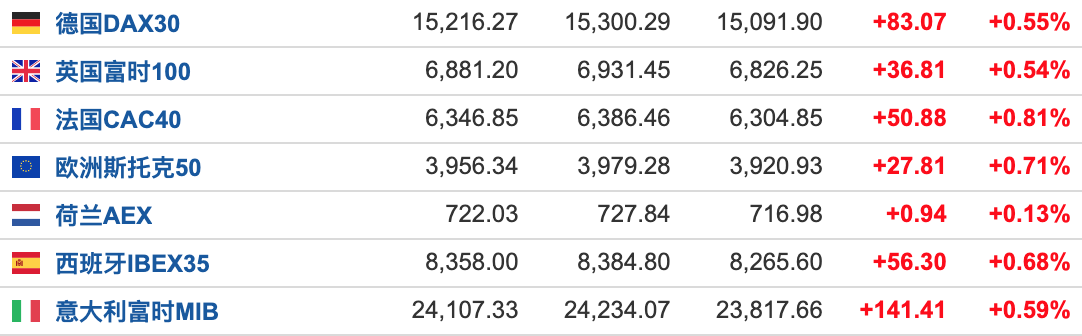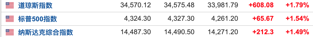 正在交易中的美国三大股指全线反弹,截至发稿,标普500指数涨1.54%,纳斯达克指数涨1.49%,道琼斯指数涨1.79%。欧洲主要股指普遍收涨。