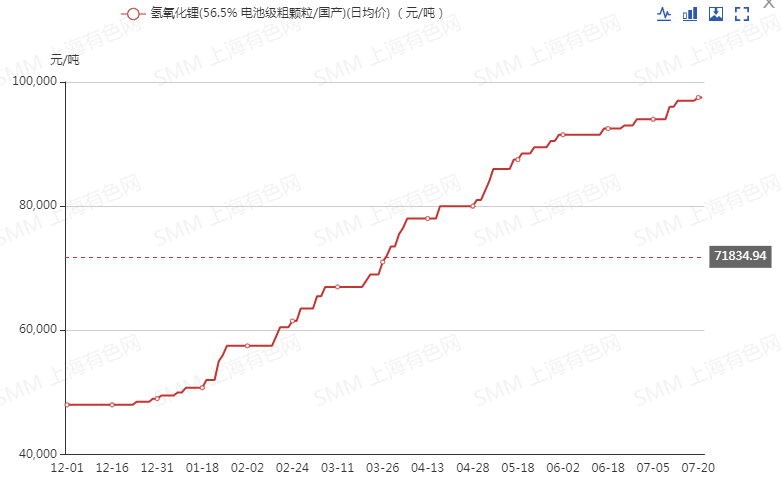据SMM历史价格显示,截止7月21日,电池级碳酸锂现货均价88000元/吨,年内涨幅70.9%;而电池级氢氧化锂现货均价97500元/吨,年内涨幅超98.7%。