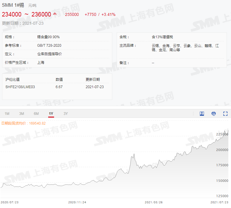 现货市场方面,年初以来,SMM 1#锡在宏观、外矿供应扰动以及南方地区限电相关因素影响下一路上涨。SMM 1#锡均价从2021年初152750元/吨涨至今日(23日) 235000元/吨,涨幅超50%。