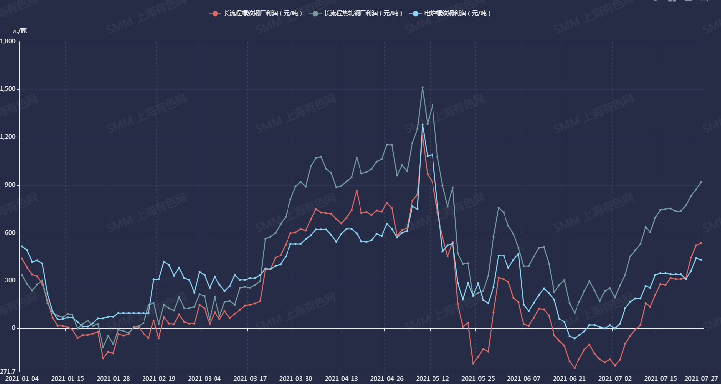 此外钢厂利润逐渐上升,由于近期粗钢压产政策影响,钢材供给端的明显减量显示,钢价表现稳中偏强。SMM数据显示,截止7月27日,电炉螺纹钢利润430元/吨,长流程螺纹钢厂利润537元/吨, 长流程热轧钢厂利润高达920元/吨。