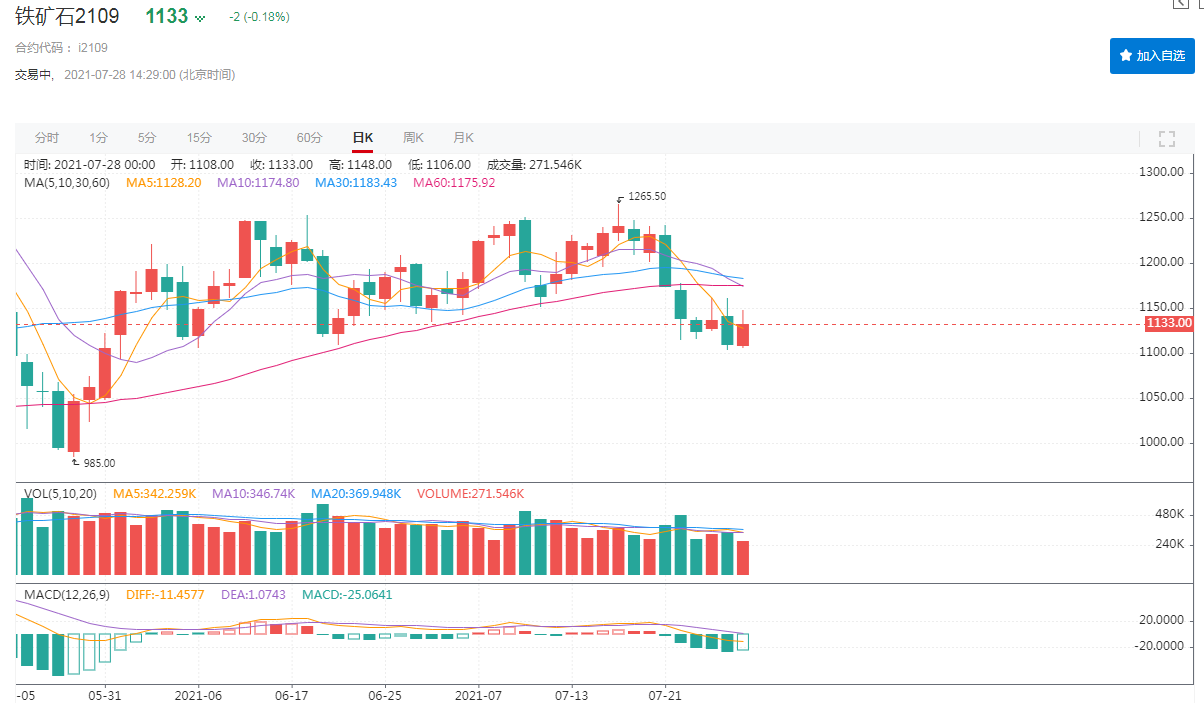 SMM7月28日讯:昨日铁矿由于受下游暴雨、台风等极端天气影响需求降低。叠加钢铁去产能“回头看”,江苏、山东等地压减粗钢产量逐步推进影响下,铁矿主力一度逼近1100点近一个月低位。而今日铁矿先扬后抑一度收复昨日跌幅,但目前铁矿市场暂无明显利多点,难以大幅反弹。