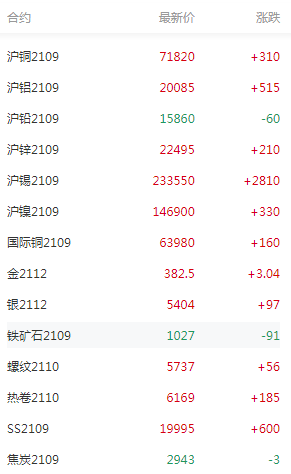 贵金属方面,沪金涨0.8%,沪银涨1.83%,国际现货金价料将创下两个多月以来的最大单周涨幅,因为有新的迹象表明美联储短期内可能不会缩减刺激和升息。