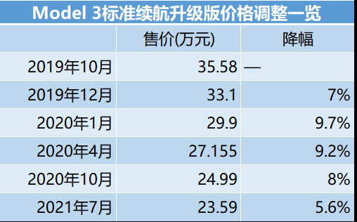7月30日,特斯拉官方微博发布消息,即日起,特斯拉Model 3标准续航升级版的价格下调1.5万元,调整后的价格为23.59万元(补贴后起售价)。