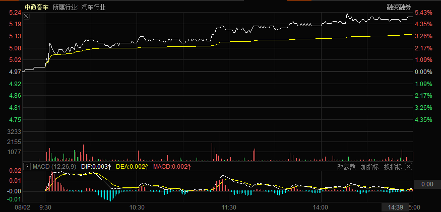 而今日白天,受上周中共中央政治局提到的关于“支持新能源汽车加快发展”的利好消息刺激,今日新能源汽车以及汽车板块都迎来了一波狂欢。截止收盘,中通客车以5.03%的涨幅报5.22元/股。