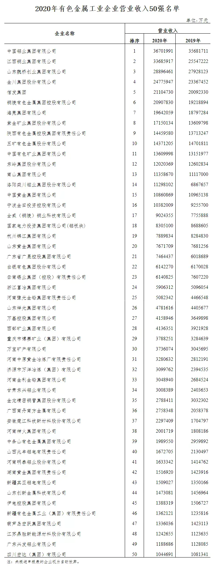 8月3日,中国有色金属工业协会召开新闻发布会,发布2020年有色金属工业企业营业收入50强名单。中国有色金属工业协会党委常委、副会长兼秘书长贾明星宣读名单。2020年,入围50强的有色金属工业企业营业收入继续保持增长态势,合计实现营业收入42509亿元,增速7.9%;入围50强的企业门槛首次提高到100亿元;入围50强的企业人均营业收入为429万元,人均净利润为8万元;据不完全统计,入围50强的企业中29家企业海外营业收入达到5956亿元(人民币),占29家企业合计实现营业收入的17.7%,入围 50强的企业中30家企业海外年末资产总额为8198亿元(人民币),占30家企业合计年末资产总额的28.1%。