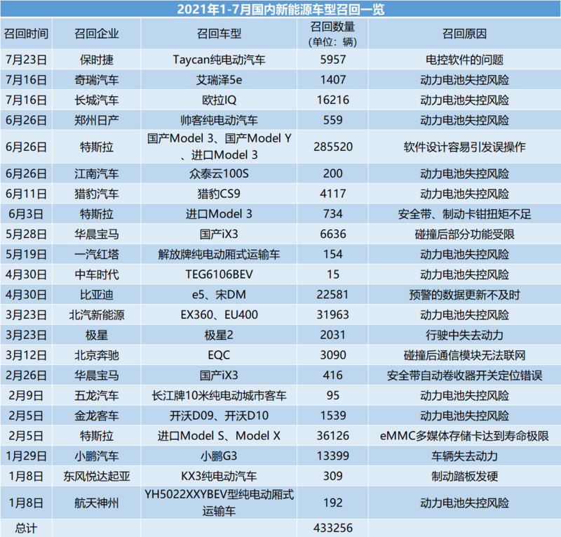 新能源汽车召回数量的猛增也是今年上半年汽车召回的特点之一,其中多涉及动力电池问题。据记者统计,1-7月涉及新能源汽车召回的次数达22次,其中召回原因为“动力电池存在失控风险”的事件多达11次。