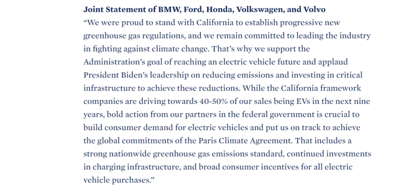 同样宝马、福特、本田、大众和沃尔沃也分别发表了联合声明支持拜登政府对于电动车产业的计划和建立温室气体排放新规,同时也强调“联邦政府的大胆举动”对于建立电动车的消费需求和重回实现《巴黎气候协定》承诺至关重要,包括严厉的全国温室气体排放标准、对充电基础设施的持续投资以及对所有电动汽车购买的广泛消费激励。